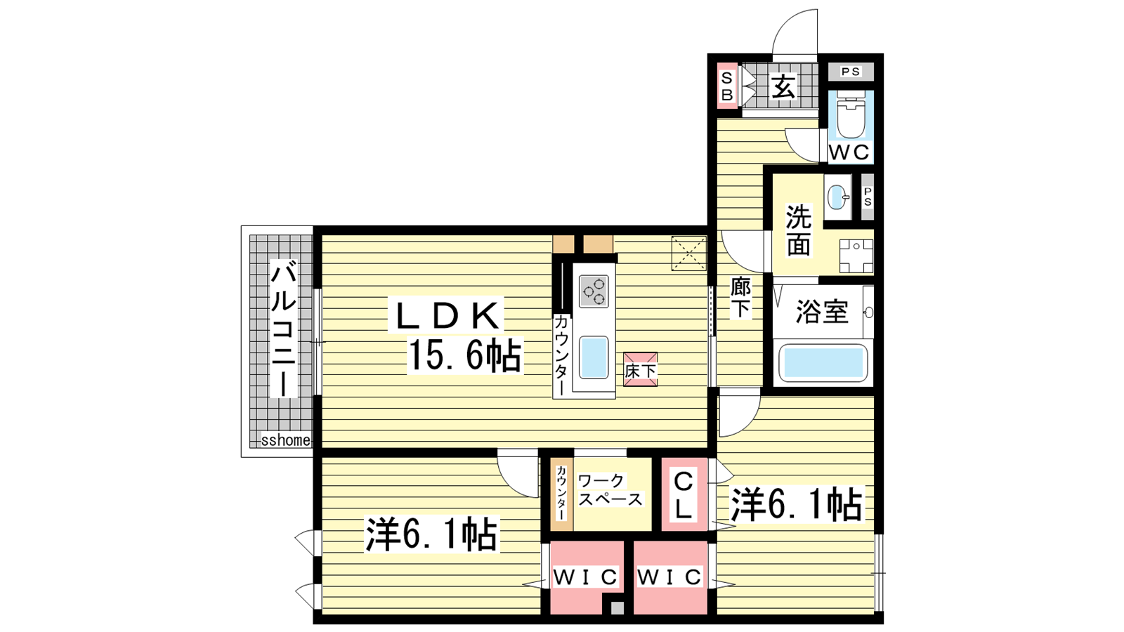 - LDK15.6帖、洋室6.1帖、洋室6.1帖
