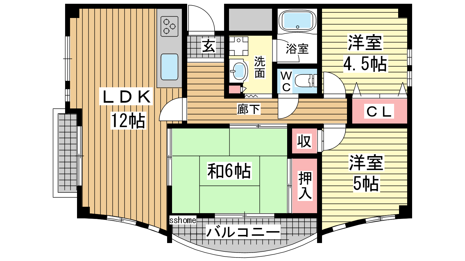 - LDK12帖、洋室4.5帖、洋室5帖、和室6帖