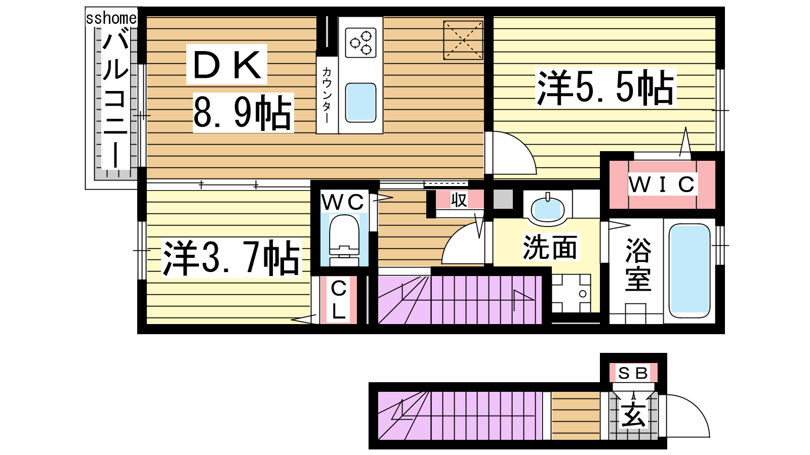 - DK8.9帖、洋室3.7帖、洋室5.5帖