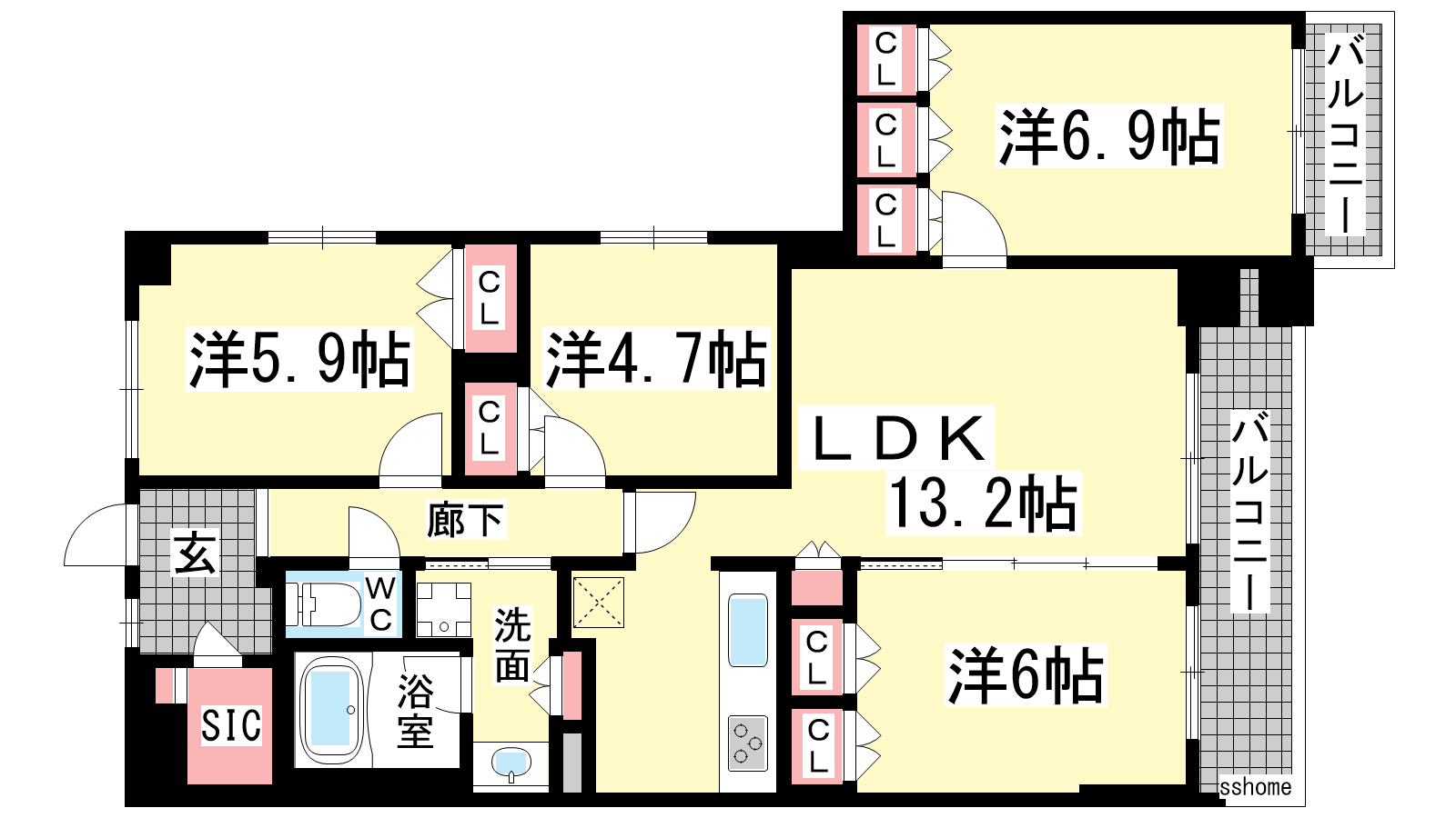 - LDK13.2帖、洋室6.9帖、洋室6帖、洋室5.9帖、洋室4.7帖