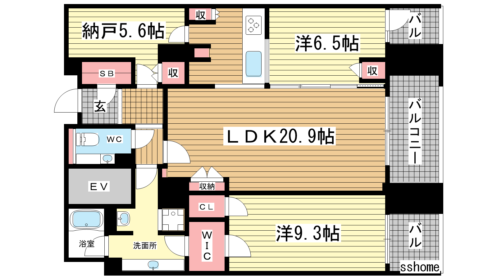 - LDK20.9帖、洋室9.3帖、洋室6.5帖、S5.6帖