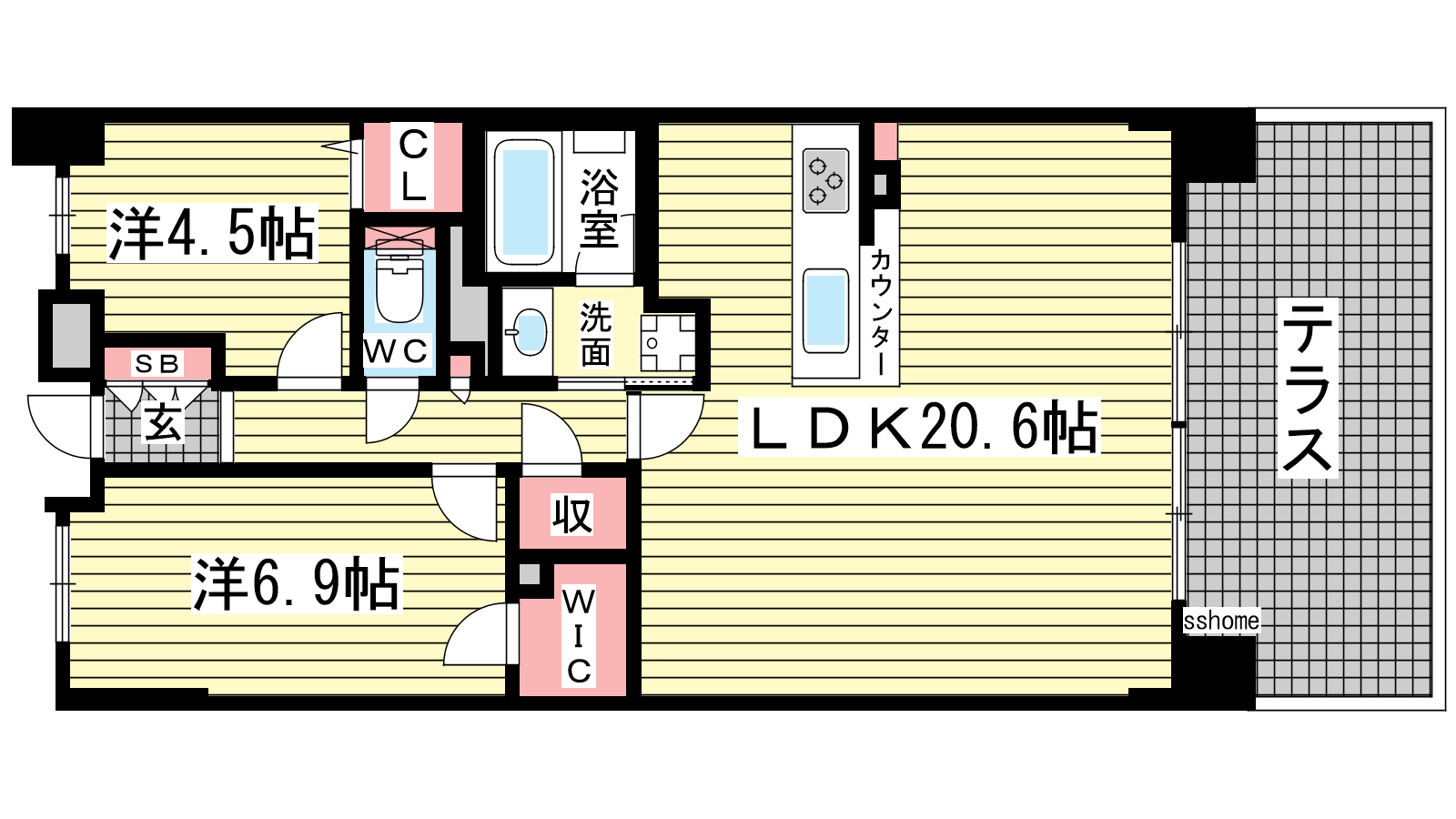 - LDK20.6帖、洋室6.9帖、洋室4.5帖