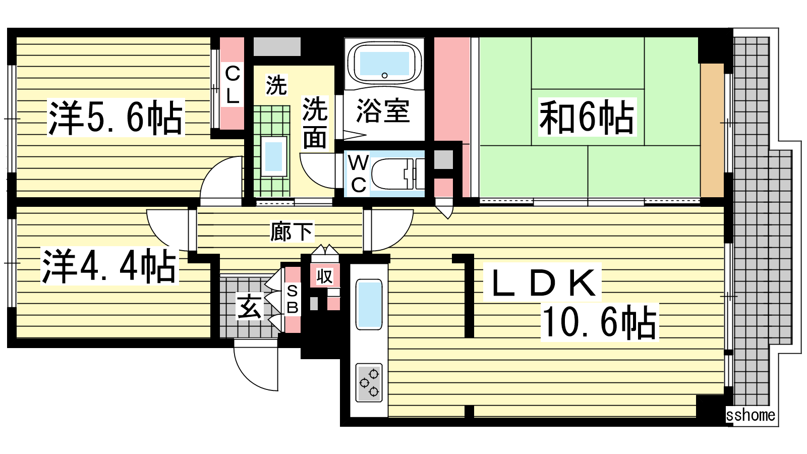 - LDK10.6帖、洋室5.6帖、洋室4.4帖、和室6帖