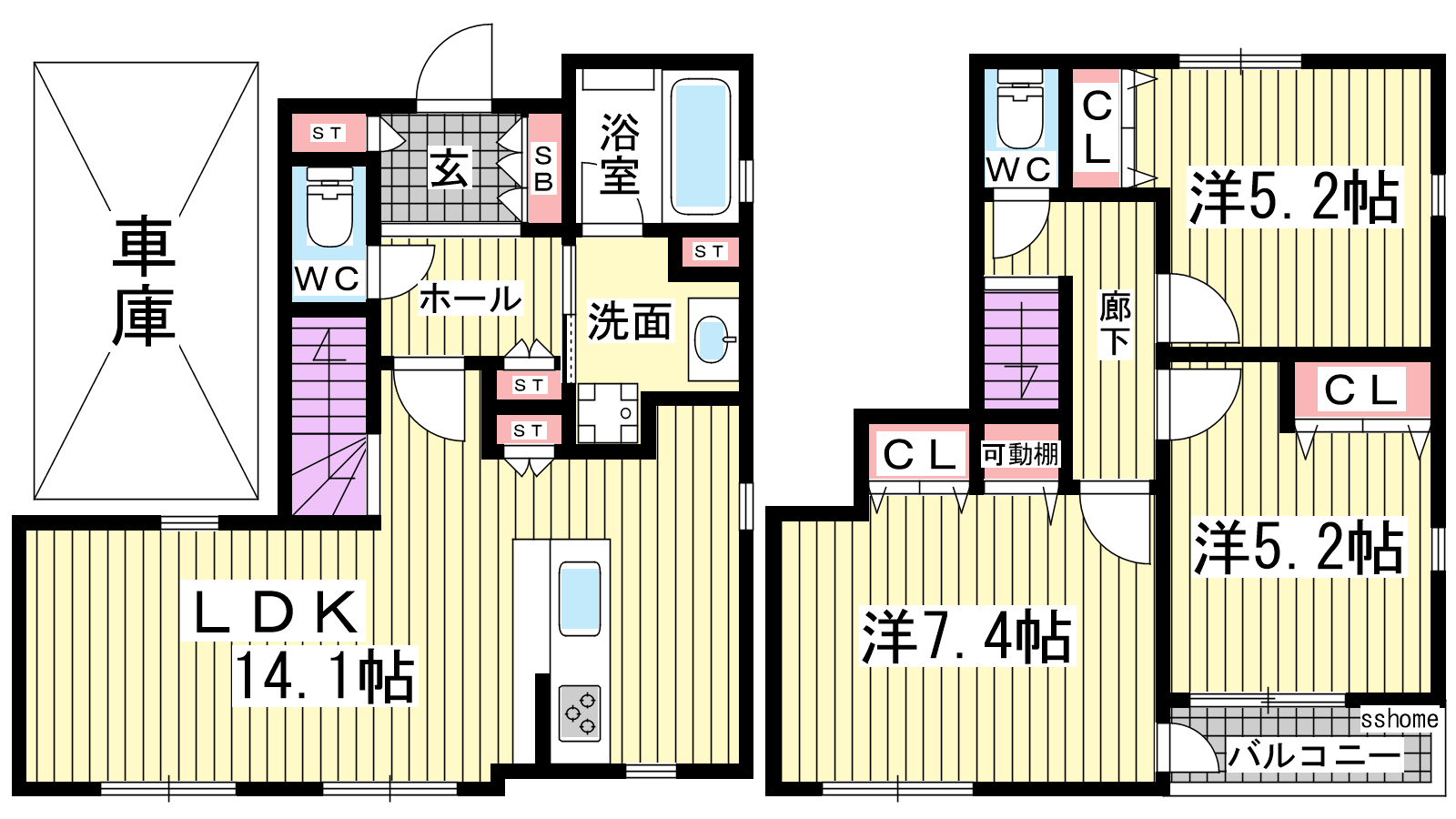 - LDK14.1帖、洋室7.4帖、洋室5.2帖、洋室5.2帖