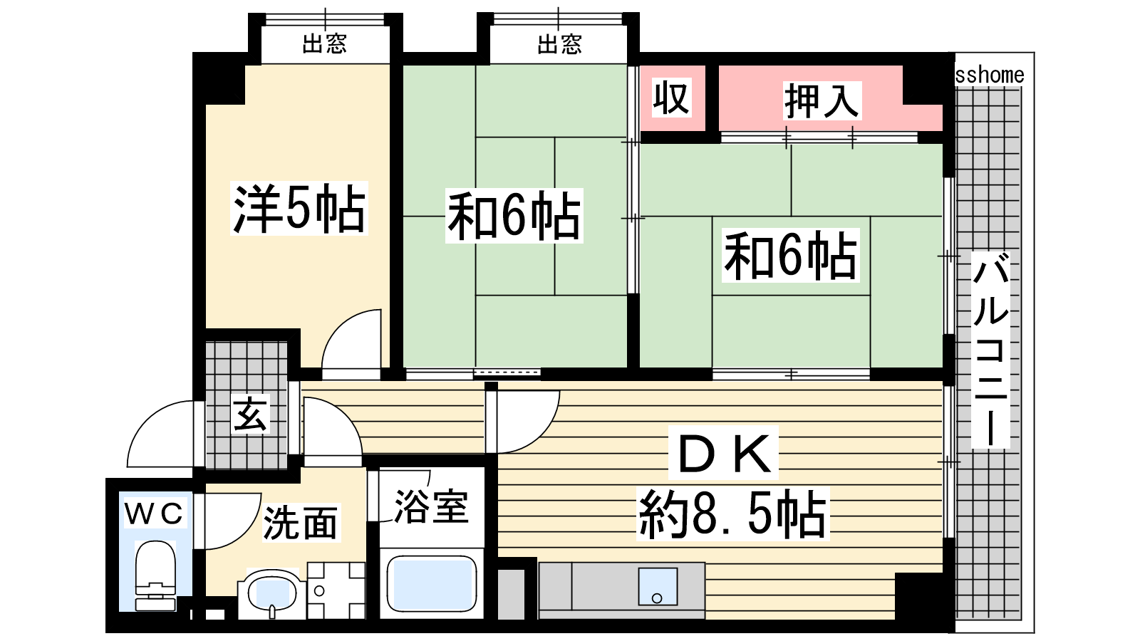 - DK8.5帖、洋室5帖、和室6帖、和室6帖