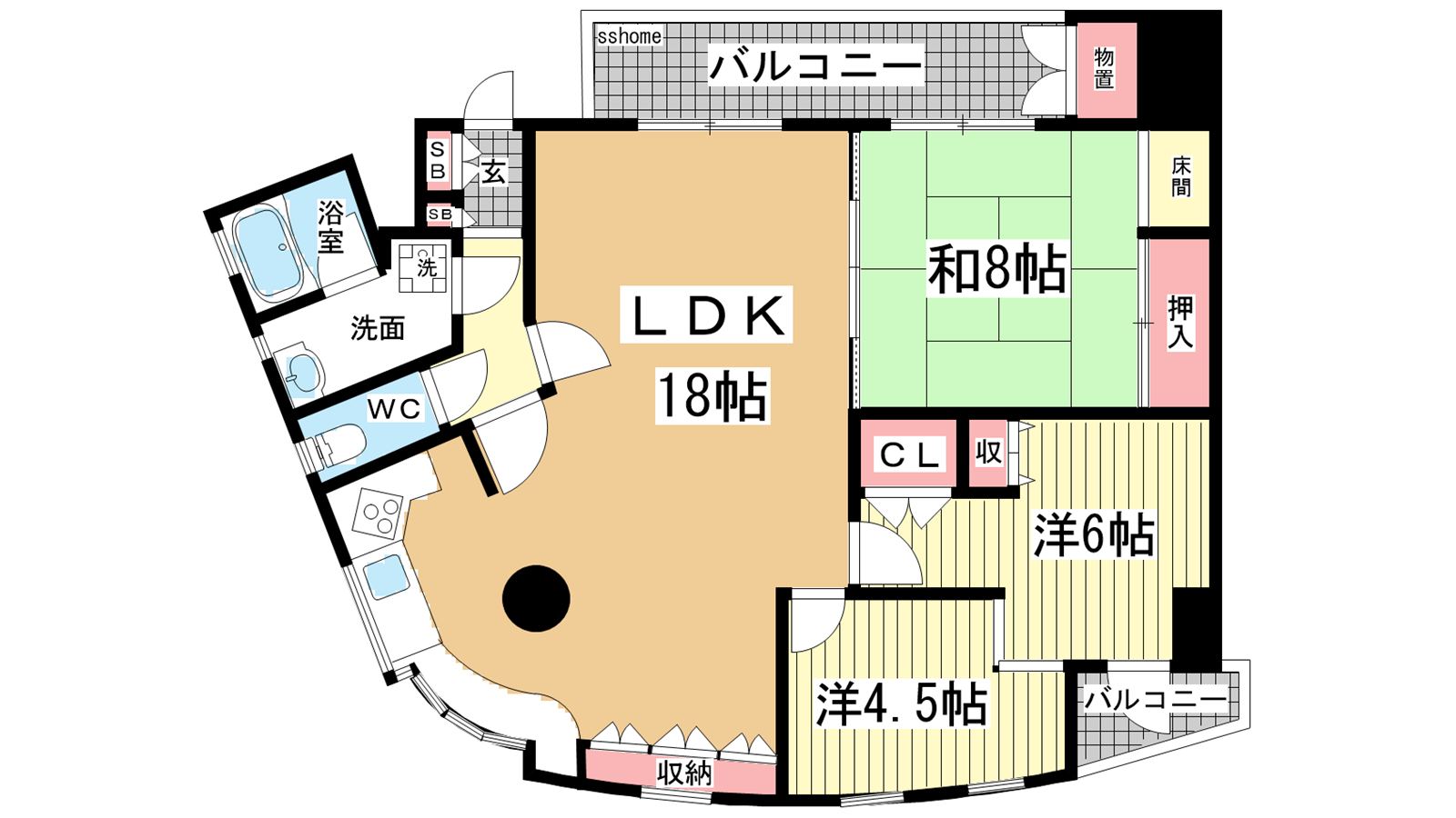 - LDK18帖、洋室6帖、洋室4.5帖、和室8帖
