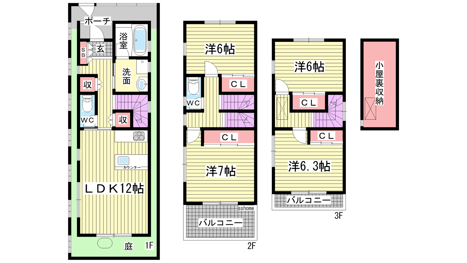 - LDK12帖、洋室7帖、洋室6.3帖、洋室6帖、洋室6帖