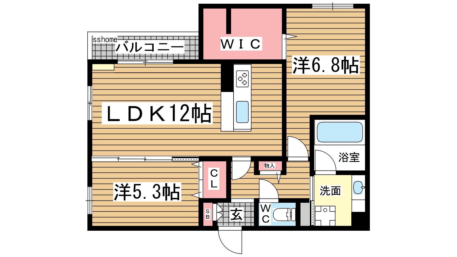 - LDK12帖、洋室5.3帖、洋室6.8帖