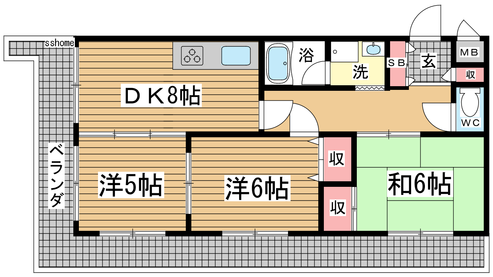 - DK8帖、洋室6帖、洋室6帖、和室5帖