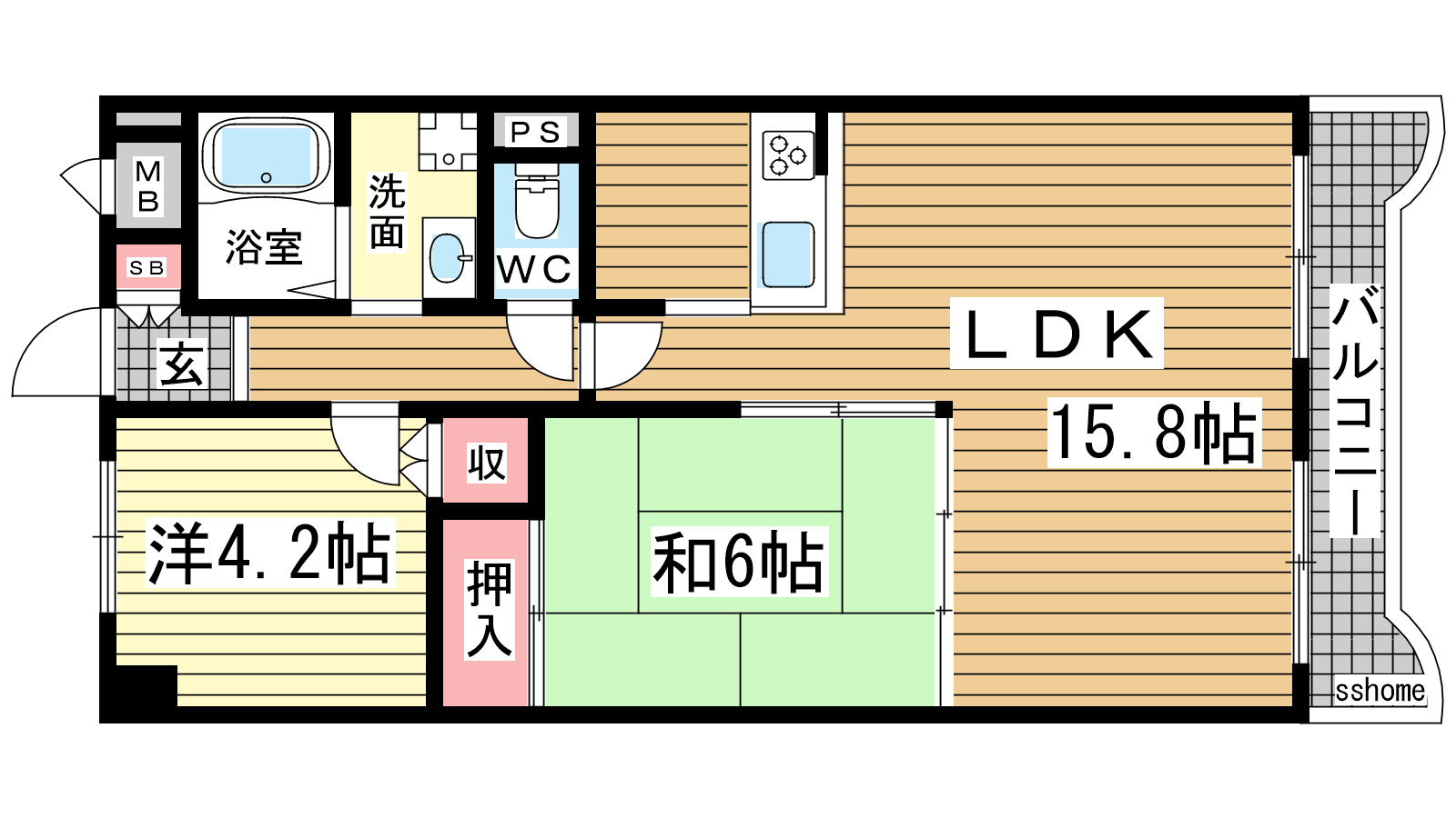 - LDK15.8帖、洋室4.2帖、和室6帖