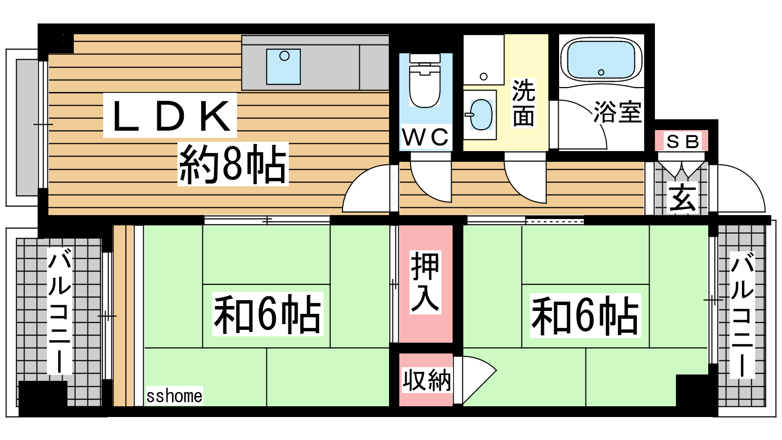- 和室6帖、和室6帖、LDK8帖