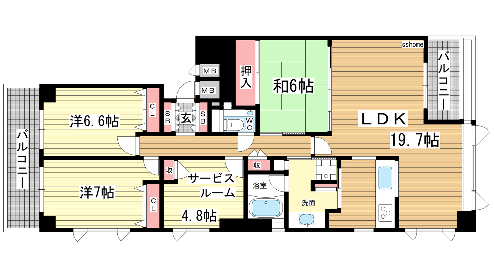 - LDK19.7帖、洋室7帖、洋室6.6帖、和室6帖、S4.8帖