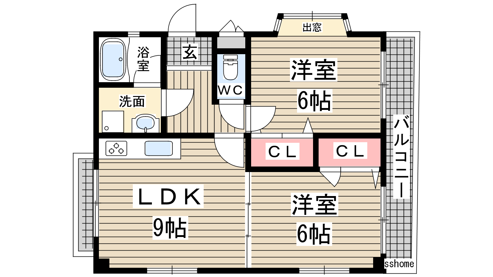 - 洋室6帖、和室6帖、LDK9帖