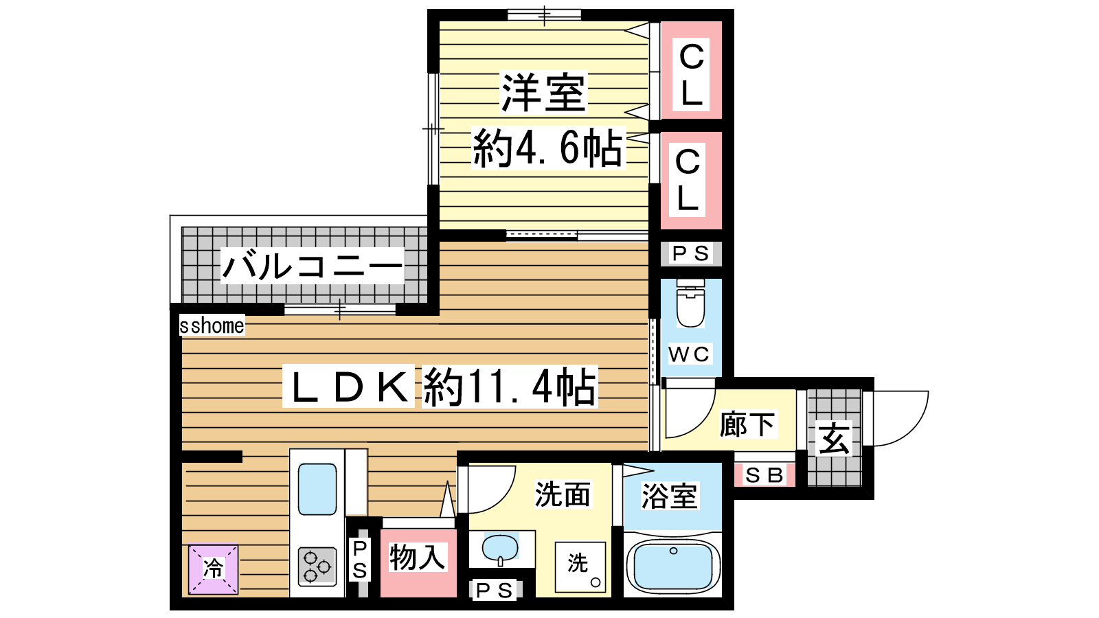 - 洋室4.6帖、LDK11.4帖