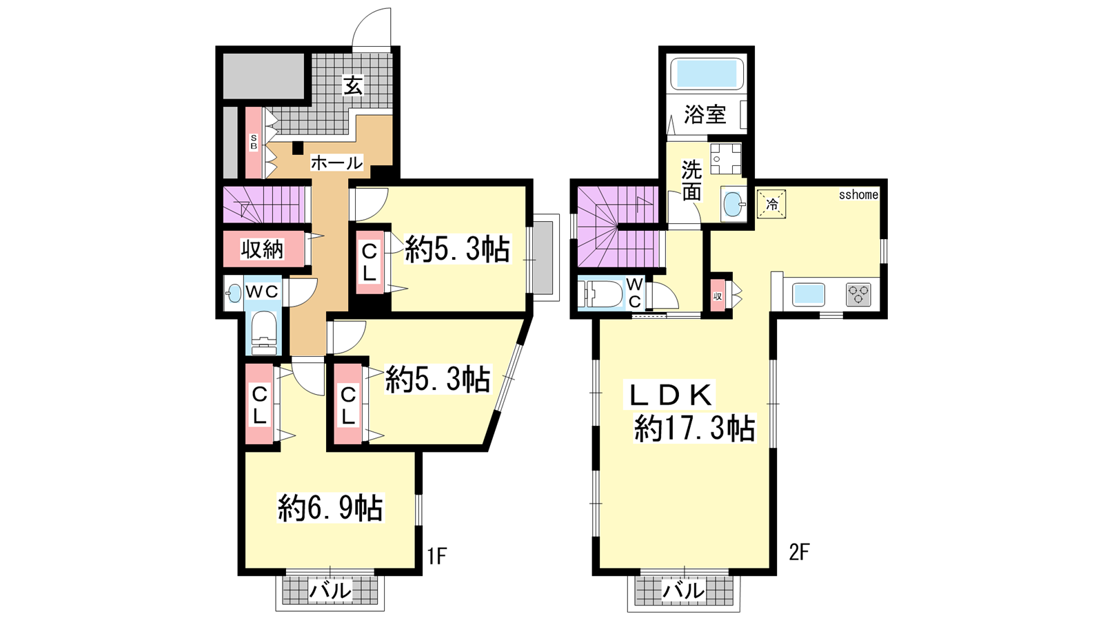 - LDK17.3帖、洋室6.9帖、洋室5.3帖、洋室5.3帖