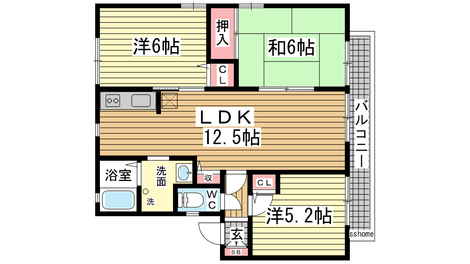- LDK12.5帖、洋室6帖、洋室5.2帖、和室6帖