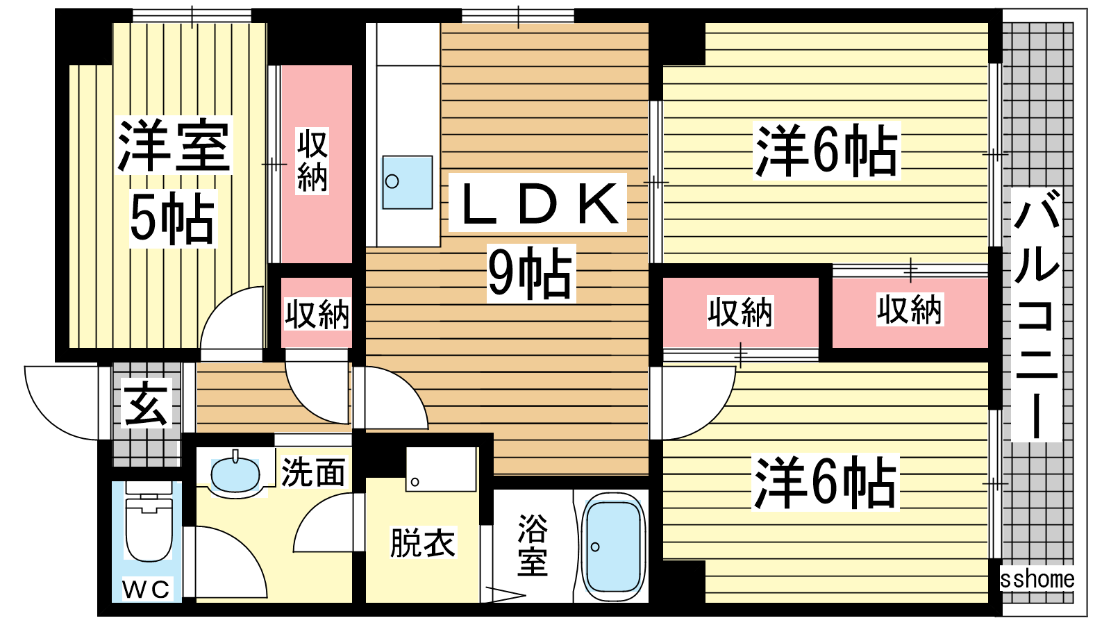 - 洋室5帖、洋室6帖、洋室6帖、DK9帖