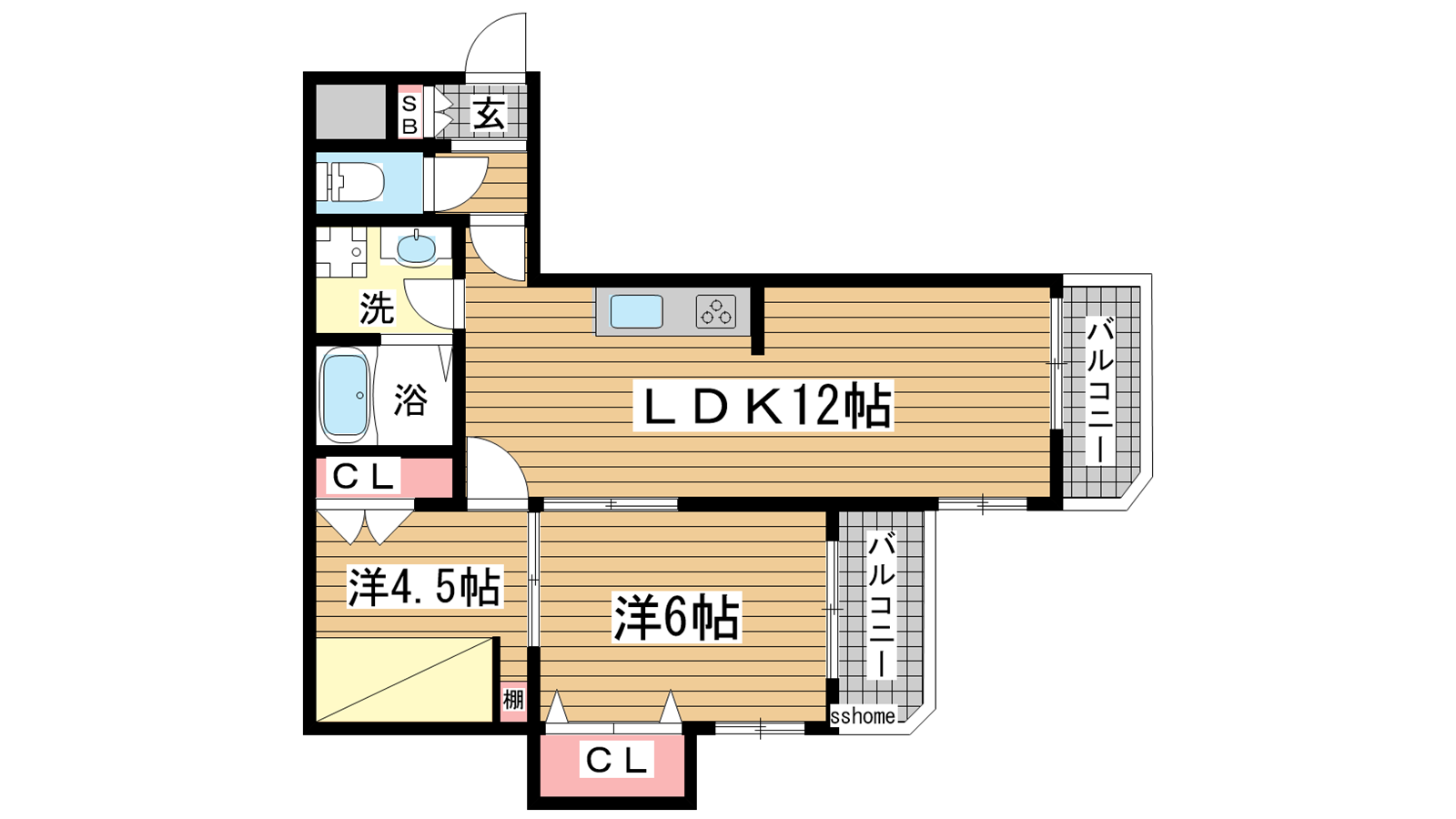 - 洋室6帖、洋室4.5帖、LDK12帖