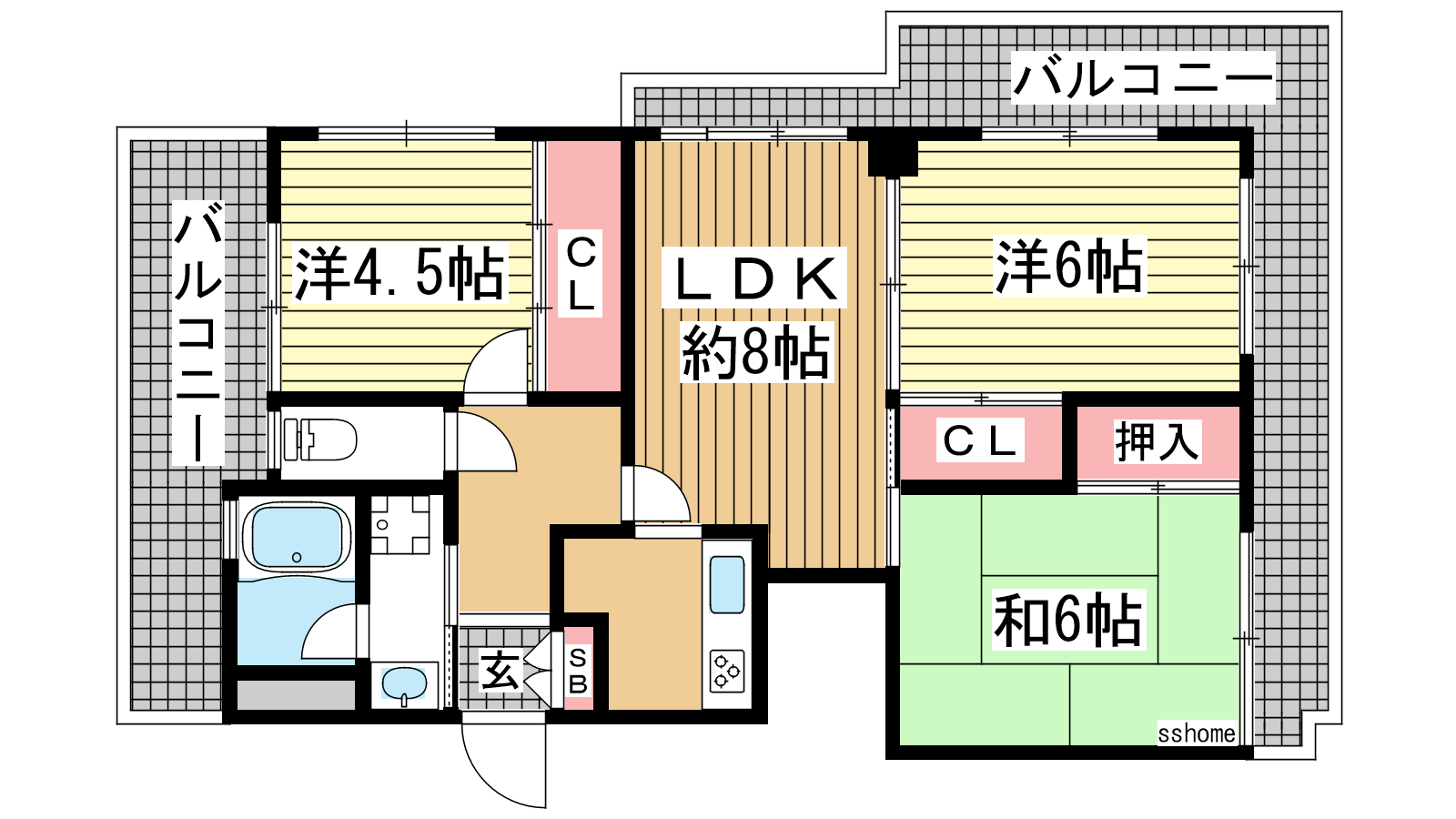 - LDK8帖、洋室6帖、洋室4.5帖、和室6帖
