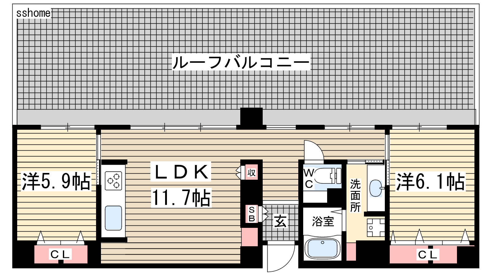 - LDK11.7帖、洋室6.1帖、洋室5.9帖