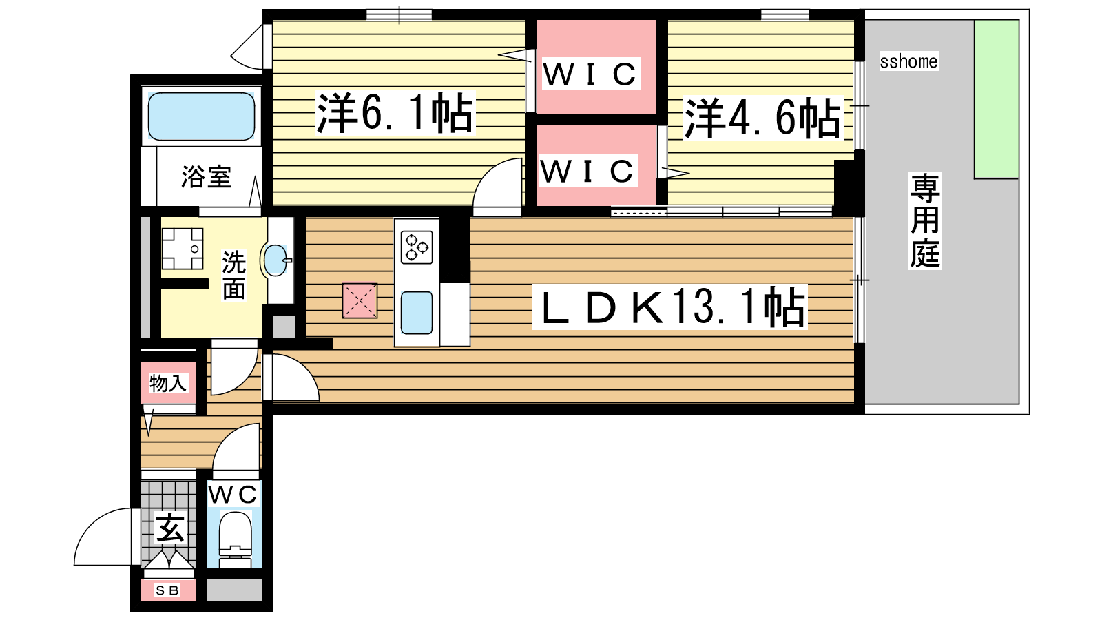 - LDK13.1帖、洋室6.1帖、洋室4.6帖
